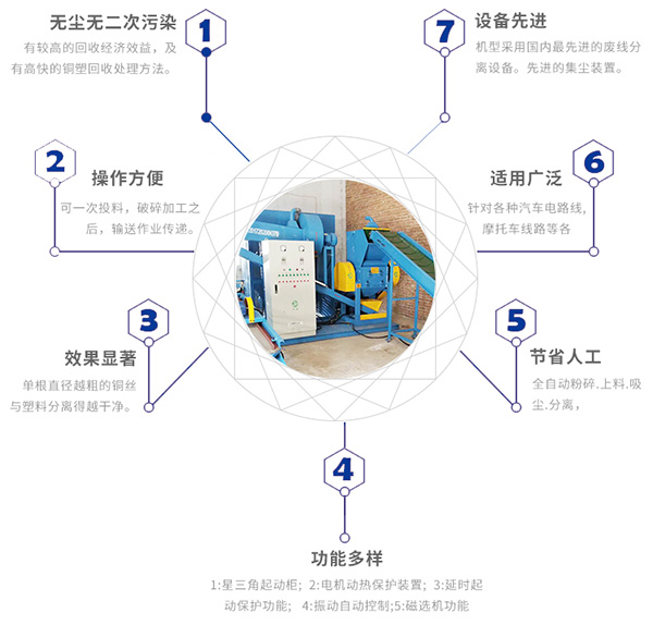 全自動(dòng)銅米機(jī)主要用于處理廢舊雜電線、毛細(xì)銅線、家用電器線、硬平方線、照明用軟電線等多種廢線的回收處理設(shè)備,把線里面的金屬與塑料的分離分選出來(lái)。全自動(dòng)銅米機(jī)又稱1000大型銅米機(jī),不但可以處理大批量的電線電纜,還可以針對(duì)不同要求進(jìn)行生產(chǎn)線配置。